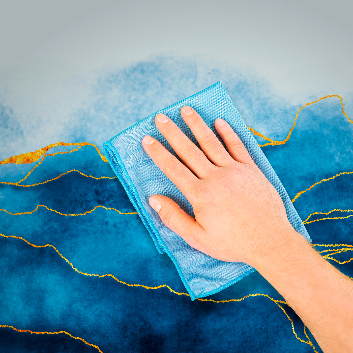 - Reinige eventuelle Verschmutzungen oder Kleberreste sofort mit einem feuchten Schwamm oder Tuch.