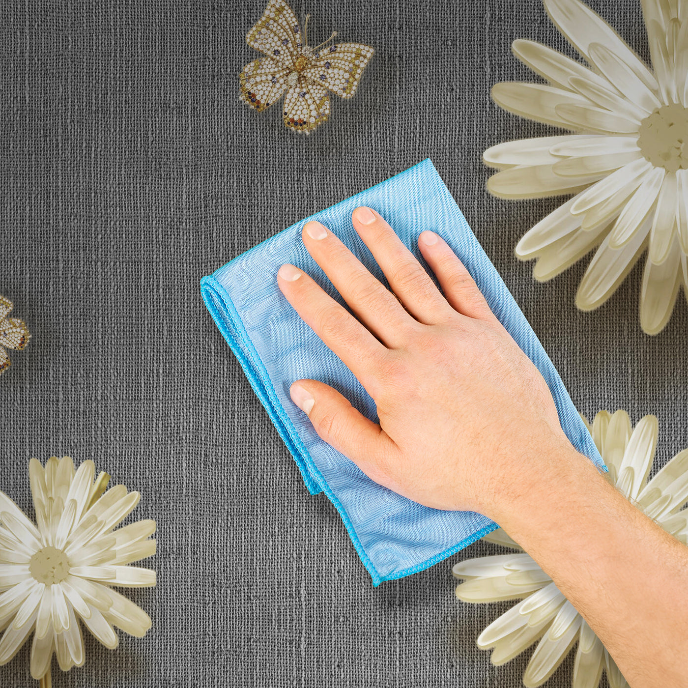 - Reinige eventuelle Verschmutzungen oder Kleberreste sofort mit einem feuchten Schwamm oder Tuch.