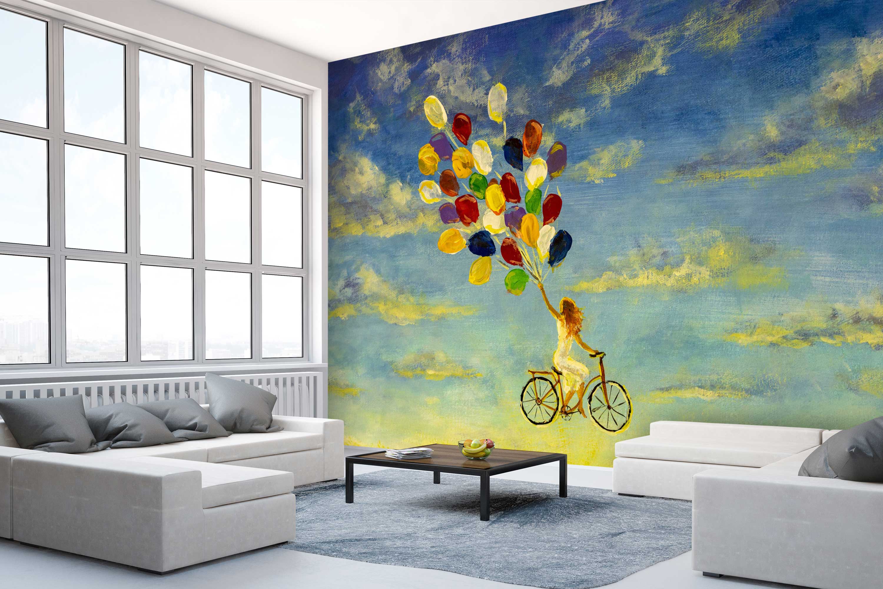 Träumst Du davon, Deine Wände in eine beeindruckende Kunstgalerie zu verwandeln? Mit unserer hochwertigen Fototapete Gemälde Frau mit Luftballons auf Fahrrad M5996 ist es jetzt möglich! Jede Wand wird zu einer Leinwand Deiner Kreativität.