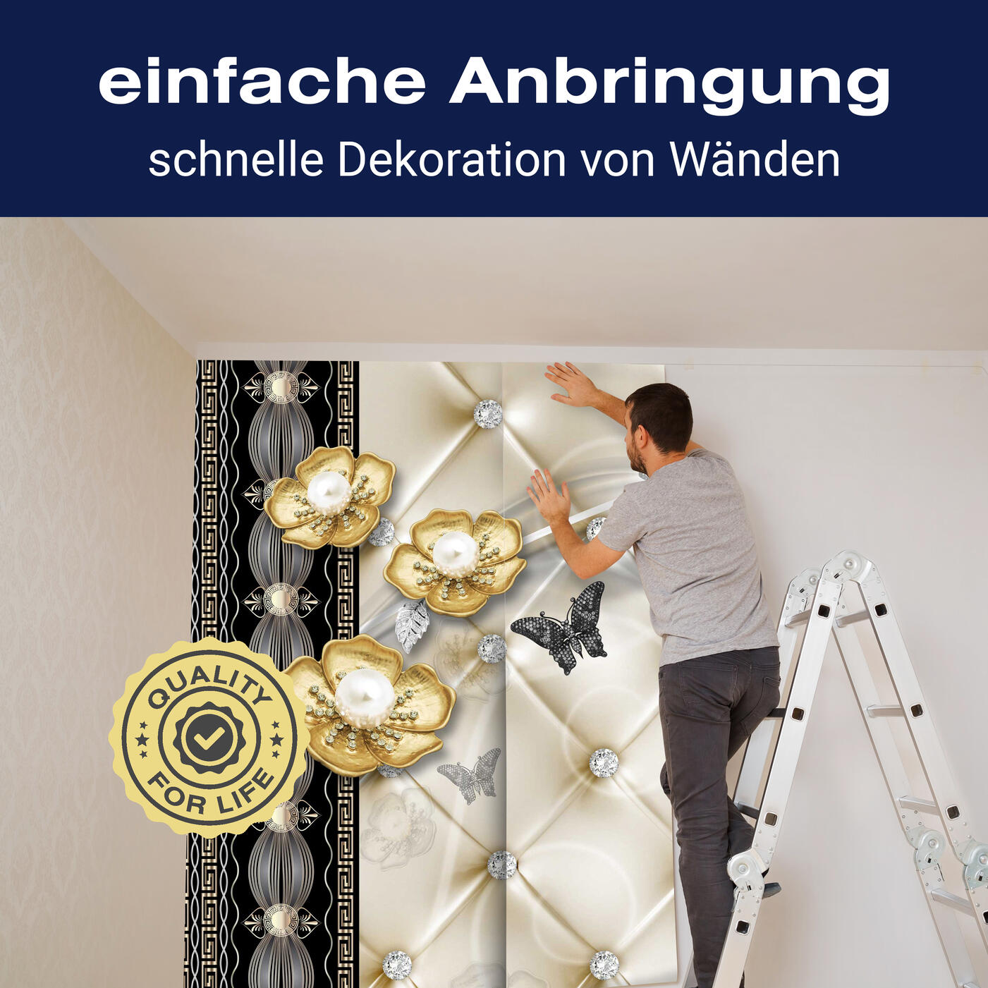 Träumst Du davon, Deine Wände in eine beeindruckende Kunstgalerie zu verwandeln? Mit unserer hochwertigen Fototapete Goldenen Blumen Silber Schmetterlinge M6129 ist es jetzt möglich! Jede Wand wird zu einer Leinwand Deiner Kreativität.