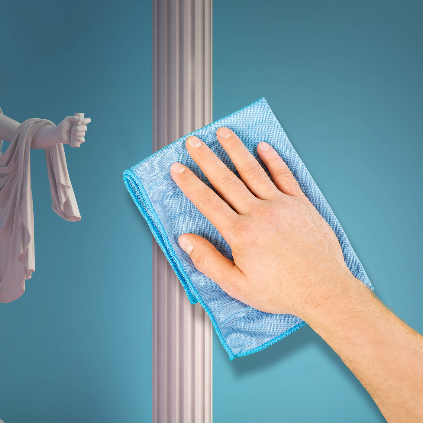 - Reinige eventuelle Verschmutzungen oder Kleberreste sofort mit einem feuchten Schwamm oder Tuch.