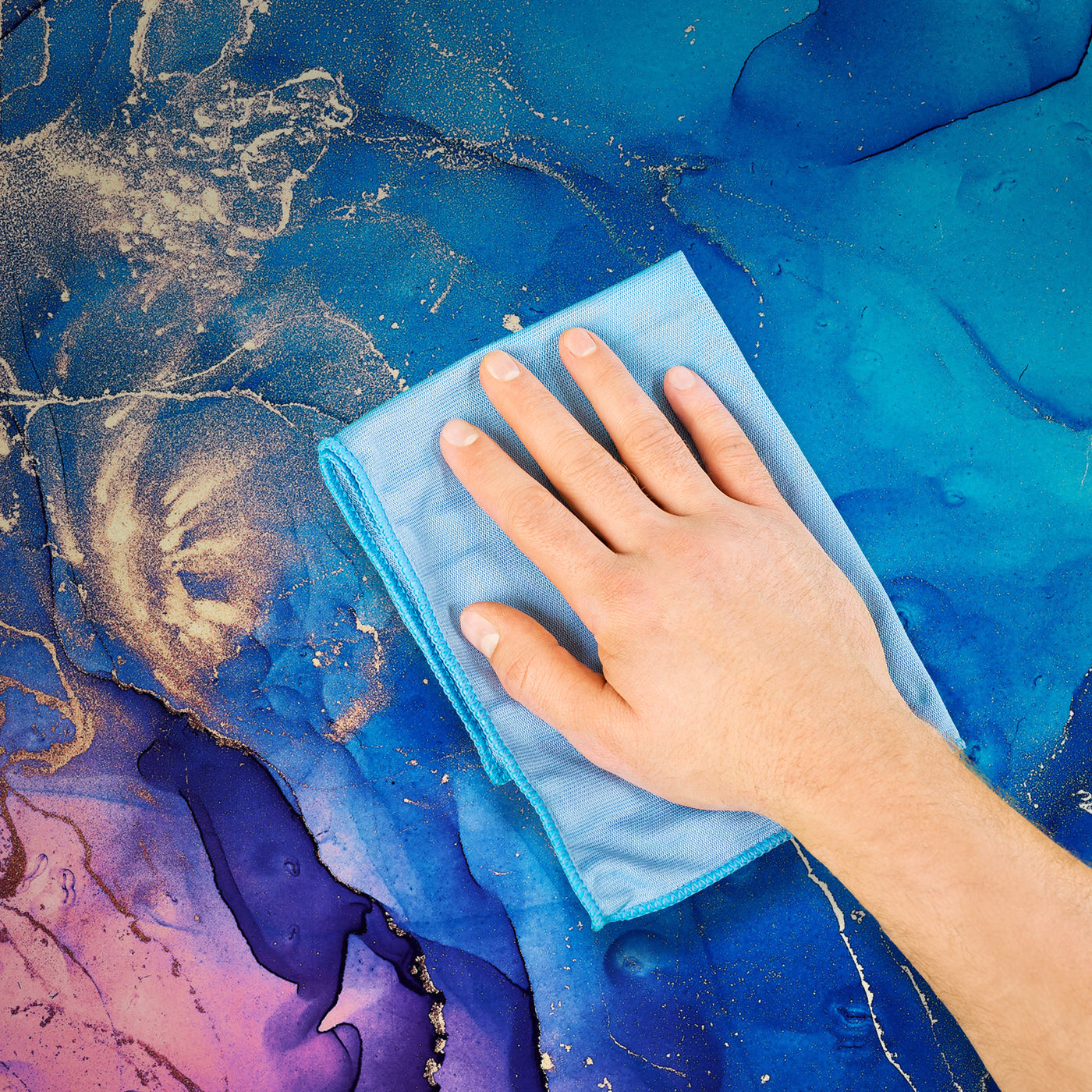 - Reinige eventuelle Verschmutzungen oder Kleberreste sofort mit einem feuchten Schwamm oder Tuch.