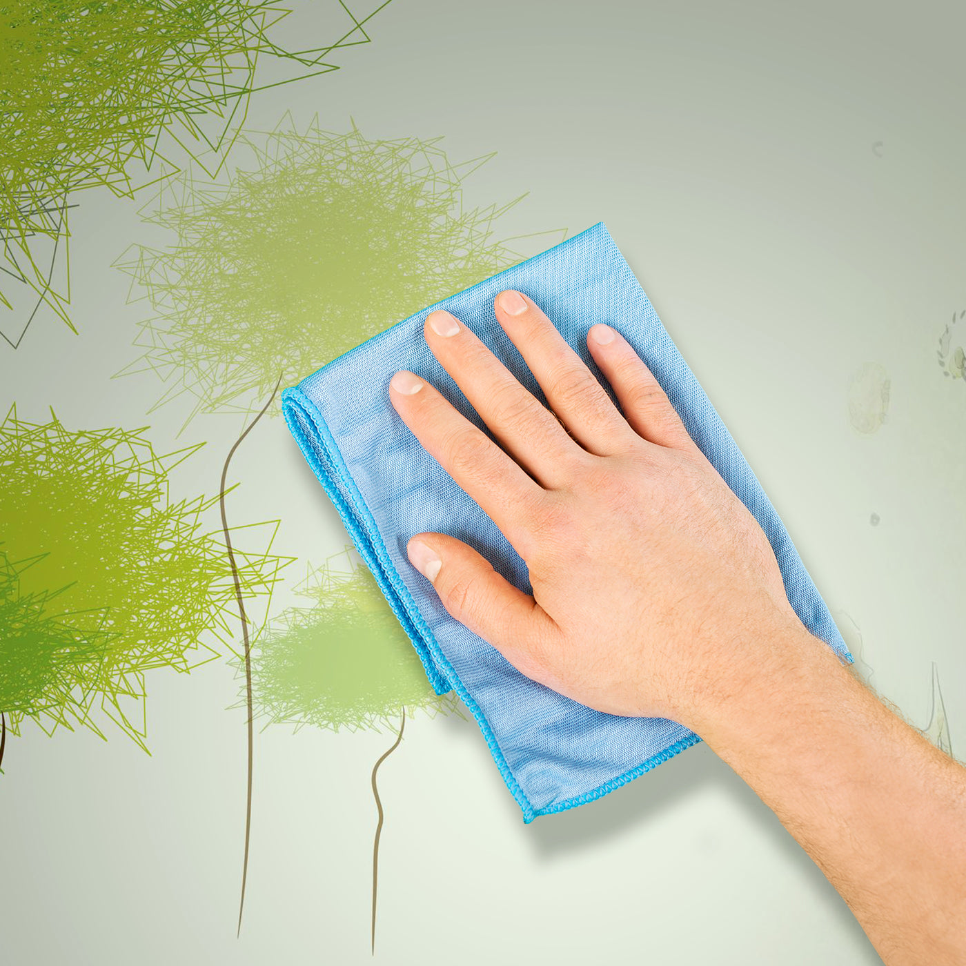 - Reinige eventuelle Verschmutzungen oder Kleberreste sofort mit einem feuchten Schwamm oder Tuch.