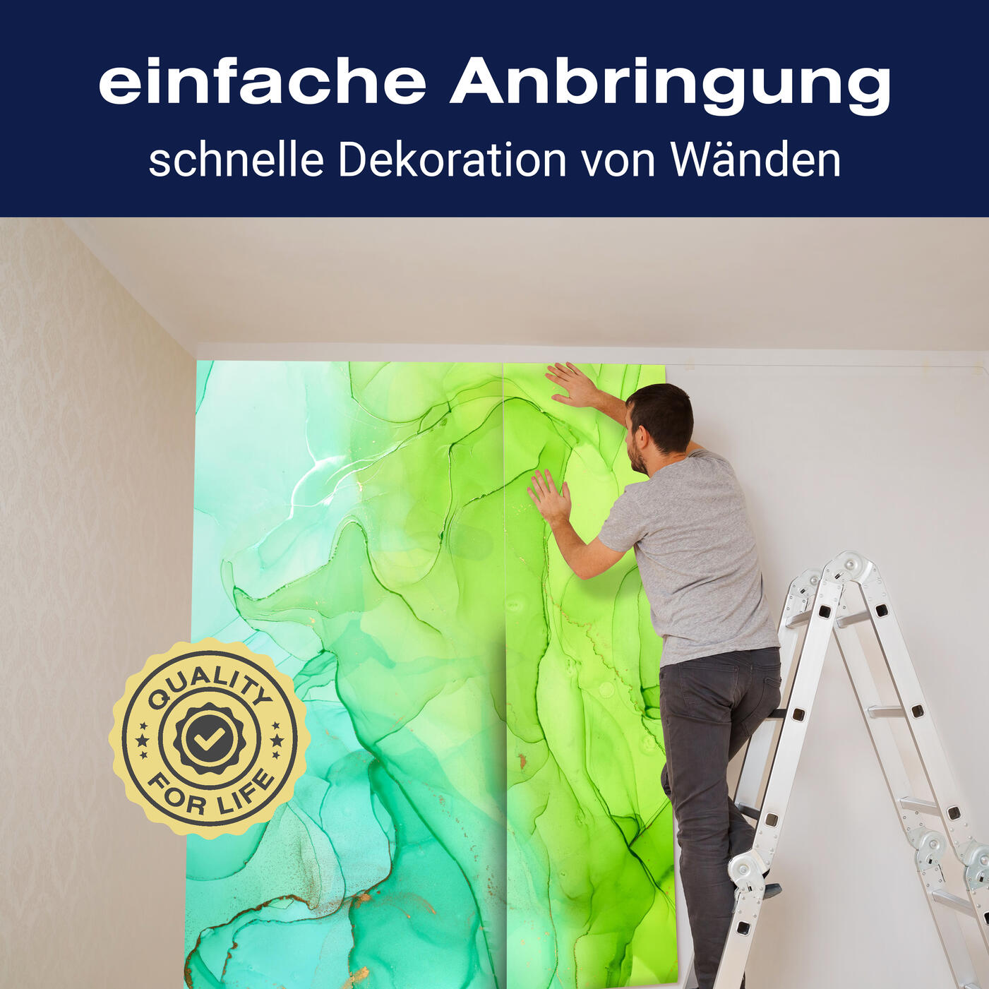 - Wenn deine Fototapete aus mehreren Bahnen besteht, achte darauf, dass die Motive oder das Design sauber und nahtlos ineinander übergehen. Achte dabei auf die Anweisungen des Herstellers oder auf eventuelle Markierungen auf der Tapete selbst.
