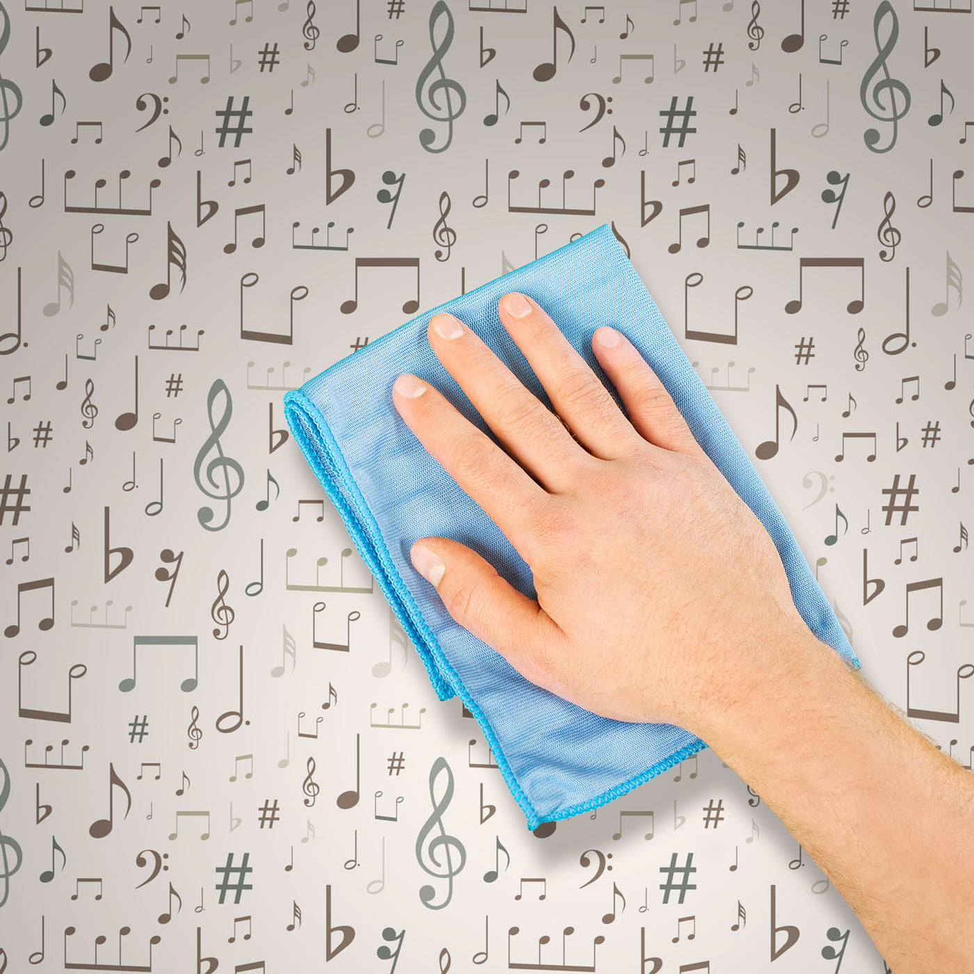- Reinige eventuelle Verschmutzungen oder Kleberreste sofort mit einem feuchten Schwamm oder Tuch.