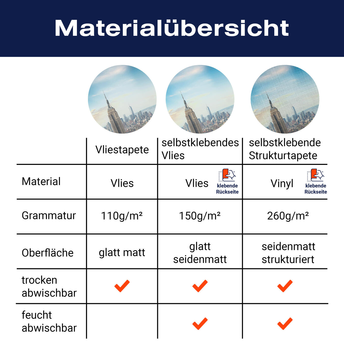 Die Fototapeten sind pflegeleicht und können mit einem feuchten Tuch gereinigt werden, ohne die Farbbrillanz zu beeinträchtigen.
