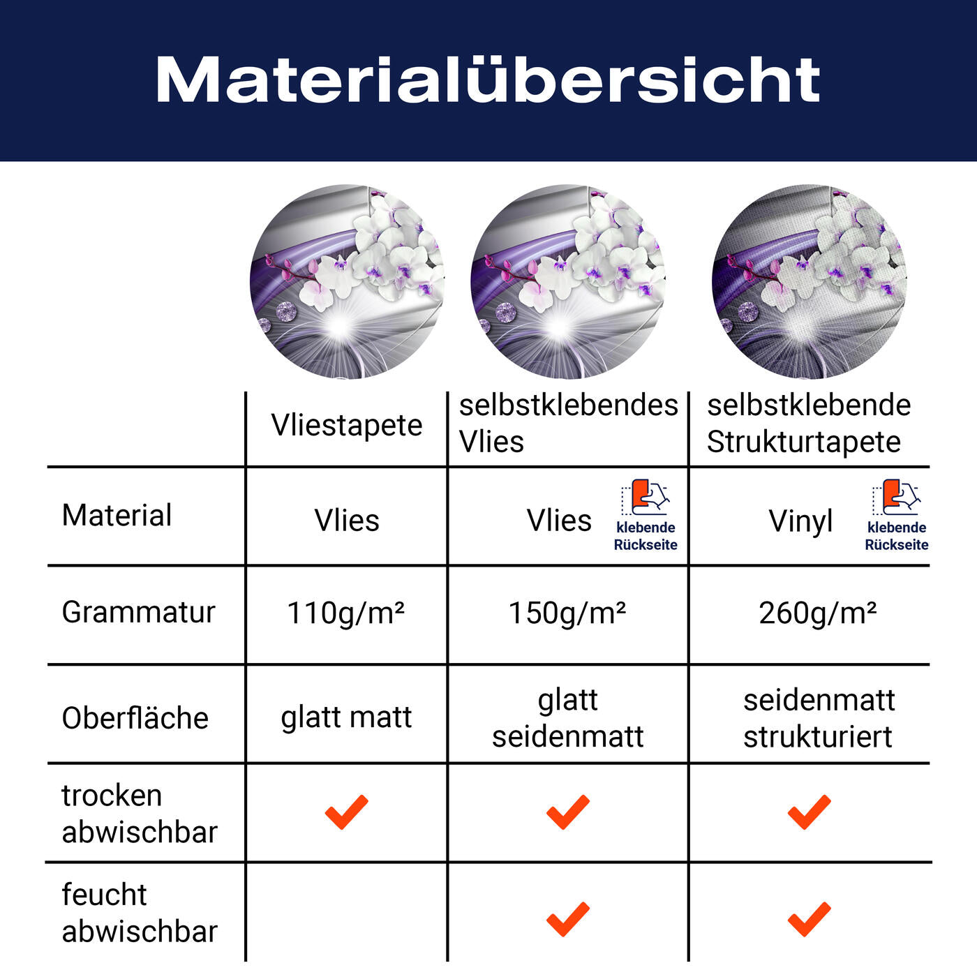 Die Fototapeten sind pflegeleicht und können mit einem feuchten Tuch gereinigt werden, ohne die Farbbrillanz zu beeinträchtigen.