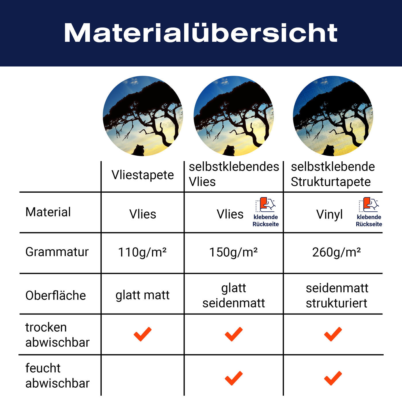 Die Fototapeten sind pflegeleicht und können mit einem feuchten Tuch gereinigt werden, ohne die Farbbrillanz zu beeinträchtigen.
