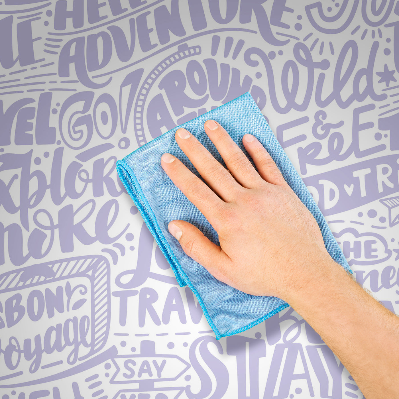 - Reinige eventuelle Verschmutzungen oder Kleberreste sofort mit einem feuchten Schwamm oder Tuch.