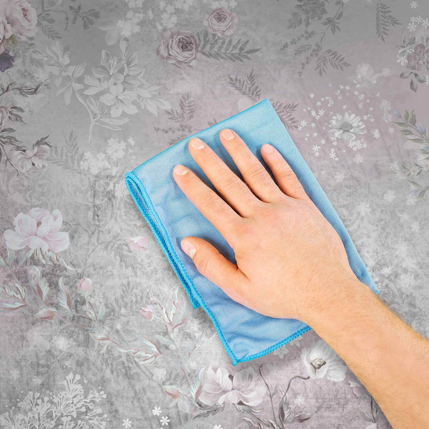- Reinige eventuelle Verschmutzungen oder Kleberreste sofort mit einem feuchten Schwamm oder Tuch.