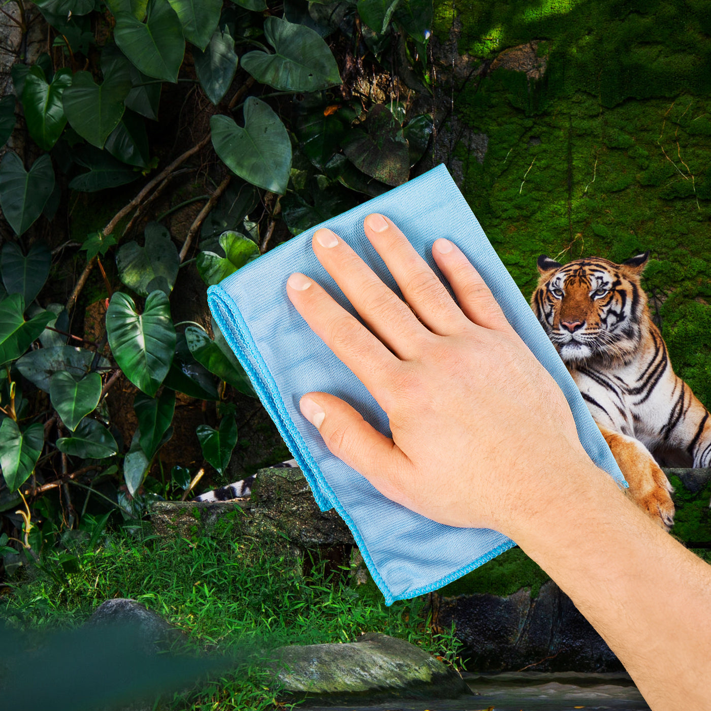 - Reinige eventuelle Kleberreste sofort mit einem feuchten Schwamm oder Tuch.