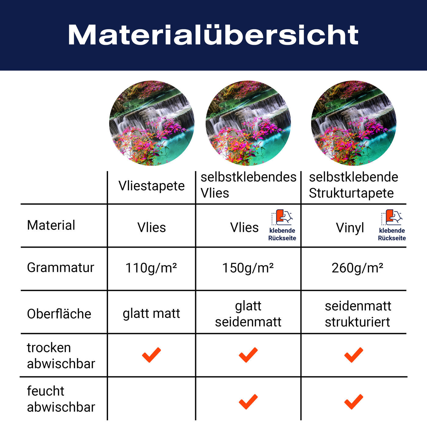Die Fototapeten sind pflegeleicht und können mit einem feuchten Tuch gereinigt werden, ohne die Farbbrillanz zu beeinträchtigen.