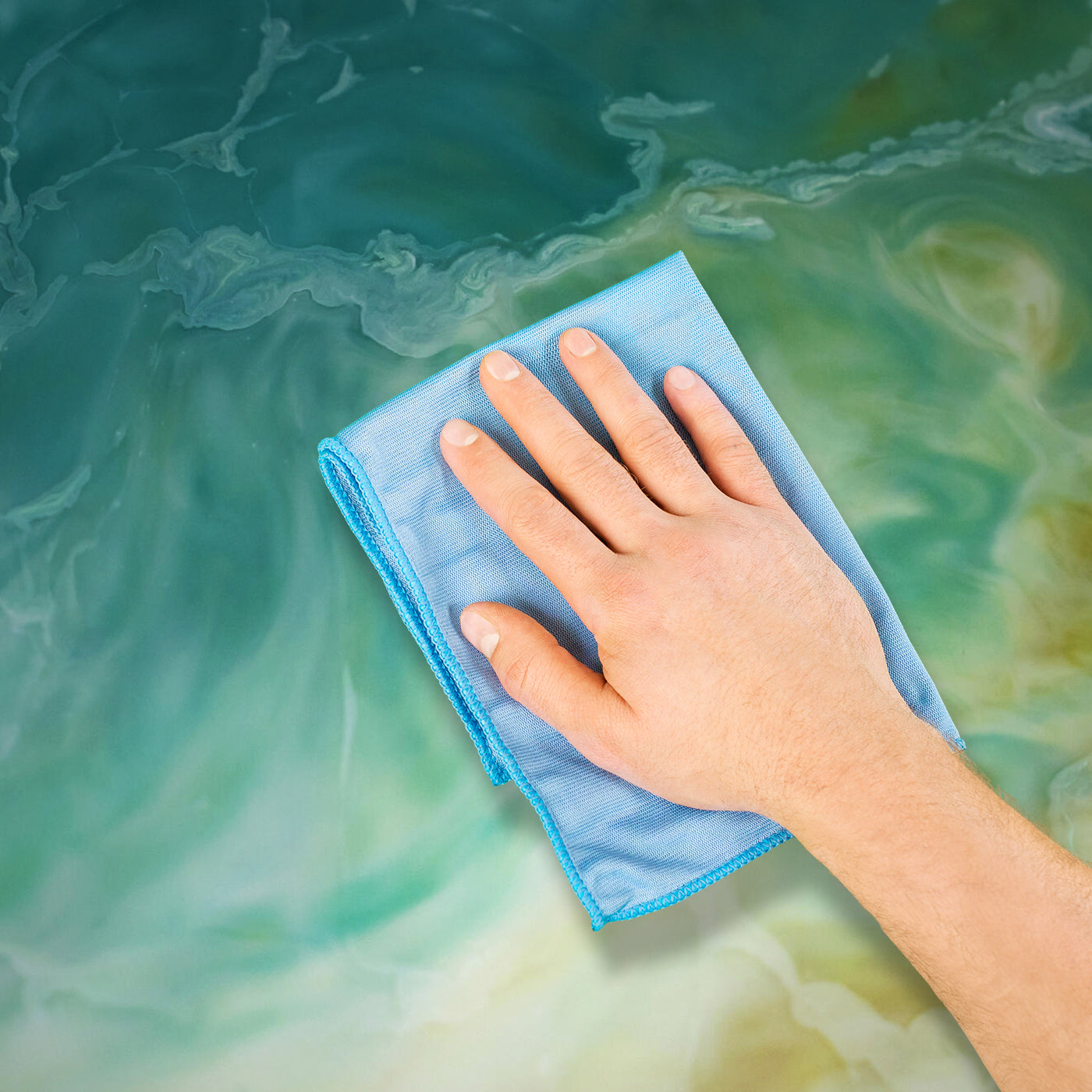 - Reinige eventuelle Verschmutzungen oder Kleberreste sofort mit einem feuchten Schwamm oder Tuch.