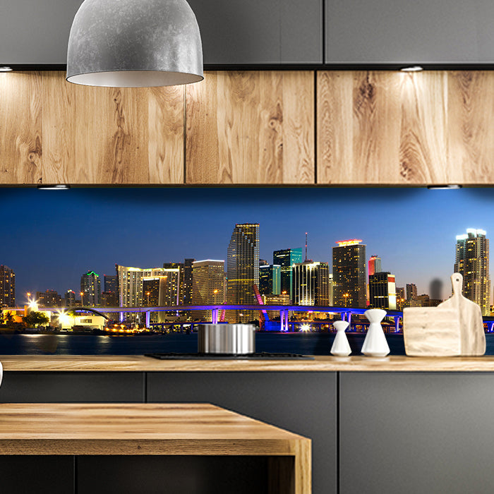 Bist Du es leid, auf die langweiligen, schwer zu reinigende Fliesen in Deiner Küche zu schauen? Stell Dir vor, wie Deine Küche mit einer stilvollen, modernen Rückwand zum Leben erwacht! Unsere Küchenrückwand 'Downtown Miami Skyline Panorama' ist nicht nur ein optisches Highlight, sondern auch praktisch und pflegeleicht.