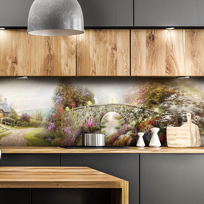 Küchenrückwand Gemalt Dorf Kirche Bach Weg Pflanzen M1232