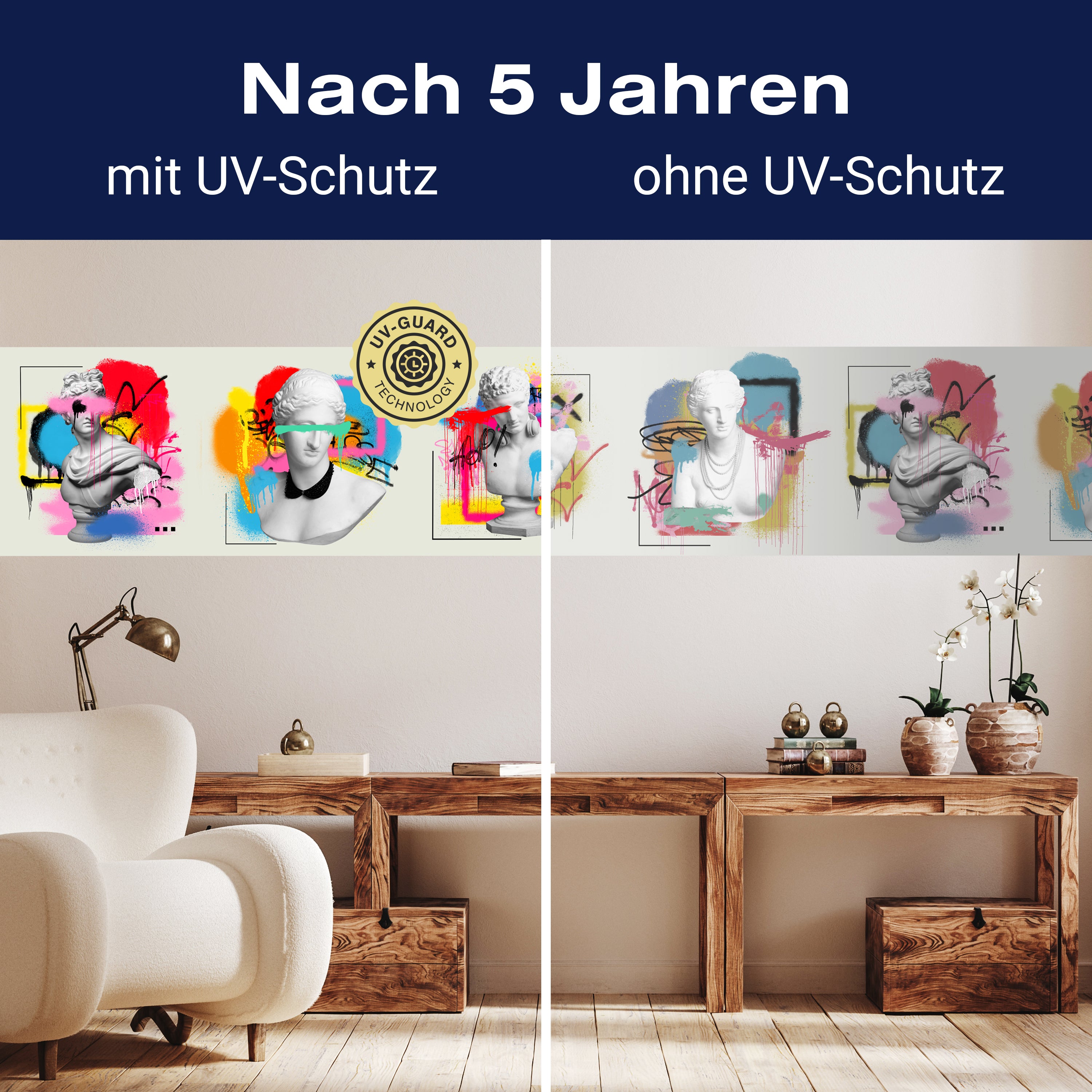 Setze auf die UV-Guard-Technologie, um deine selbstklebenden Panorama-Fototapeten nicht nur atemberaubend, sondern auch dauerhaft strahlend zu gestalten. Dieser fortschrittliche UV-Schutz sorgt dafür, dass die lebhaften Farben und scharfen Details deiner Wandgestaltung gegen die bleichende Wirkung der Sonnenstrahlen geschützt sind. Egal, wie intensiv das Sonnenlicht ist, die UV-Guard-Technologie bewahrt die Brillanz und Tiefe deiner Bilder, sodass sie jahrelang wie neu aussehen. Mach dir keine Sorgen mehr über verblassende Farben oder den Verlust von Detailreichtum. Mit dieser Technologie investierst du in die Langlebigkeit und Schönheit deiner Räume. Steige jetzt um auf UV-Guard und genieße ungetrübte Farbenpracht bei jedem Licht.