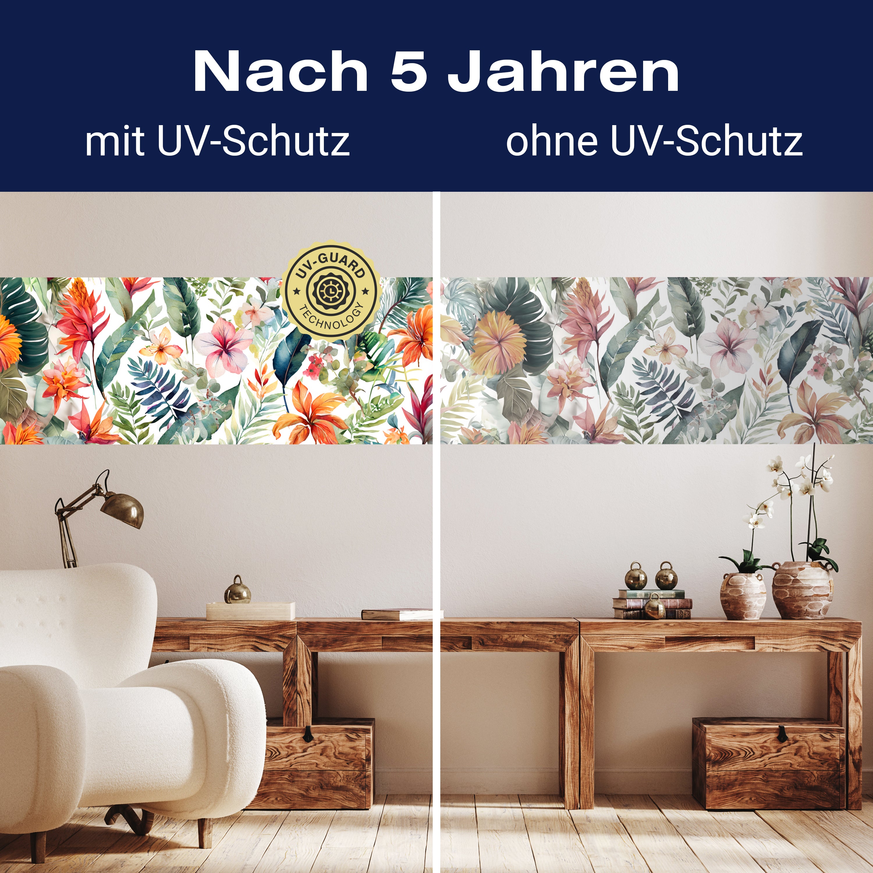 Setze auf die UV-Guard-Technologie, um deine selbstklebenden Panorama-Fototapeten nicht nur atemberaubend, sondern auch dauerhaft strahlend zu gestalten. Dieser fortschrittliche UV-Schutz sorgt dafür, dass die lebhaften Farben und scharfen Details deiner Wandgestaltung gegen die bleichende Wirkung der Sonnenstrahlen geschützt sind. Egal, wie intensiv das Sonnenlicht ist, die UV-Guard-Technologie bewahrt die Brillanz und Tiefe deiner Bilder, sodass sie jahrelang wie neu aussehen. Mach dir keine Sorgen mehr über verblassende Farben oder den Verlust von Detailreichtum. Mit dieser Technologie investierst du in die Langlebigkeit und Schönheit deiner Räume. Steige jetzt um auf UV-Guard und genieße ungetrübte Farbenpracht bei jedem Licht.