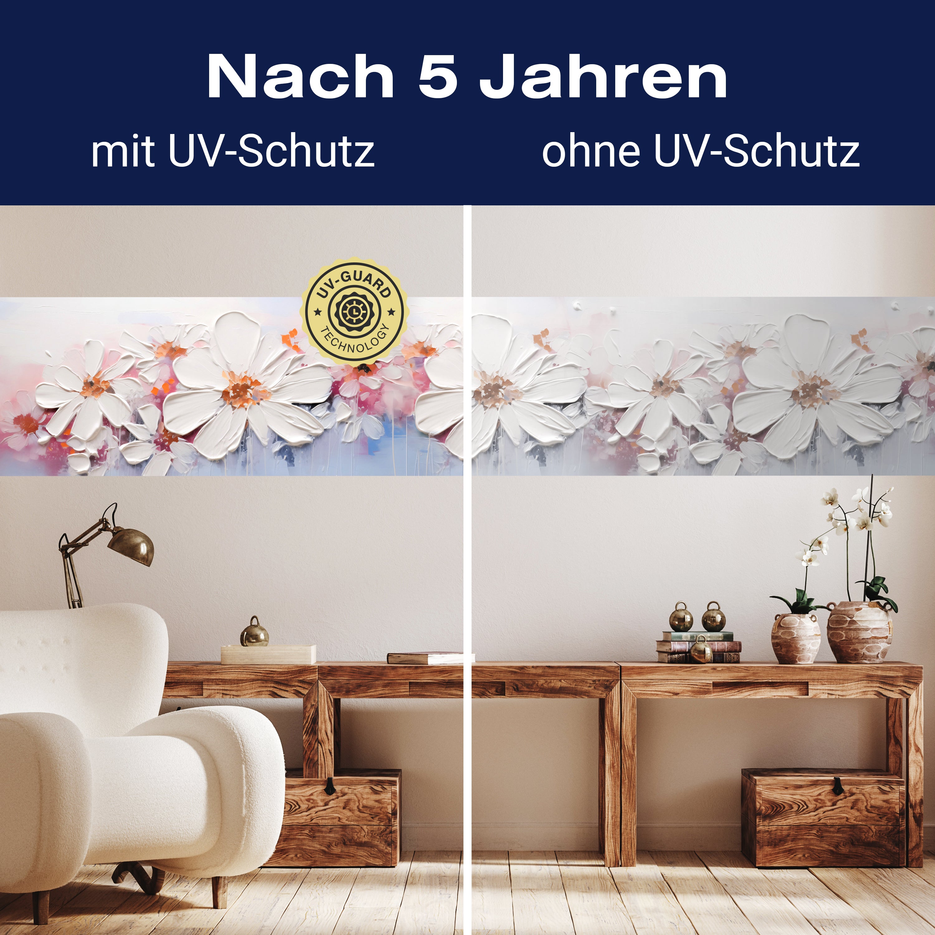 Setze auf die UV-Guard-Technologie, um deine selbstklebenden Panorama-Fototapeten nicht nur atemberaubend, sondern auch dauerhaft strahlend zu gestalten. Dieser fortschrittliche UV-Schutz sorgt dafür, dass die lebhaften Farben und scharfen Details deiner Wandgestaltung gegen die bleichende Wirkung der Sonnenstrahlen geschützt sind. Egal, wie intensiv das Sonnenlicht ist, die UV-Guard-Technologie bewahrt die Brillanz und Tiefe deiner Bilder, sodass sie jahrelang wie neu aussehen. Mach dir keine Sorgen mehr über verblassende Farben oder den Verlust von Detailreichtum. Mit dieser Technologie investierst du in die Langlebigkeit und Schönheit deiner Räume. Steige jetzt um auf UV-Guard und genieße ungetrübte Farbenpracht bei jedem Licht.