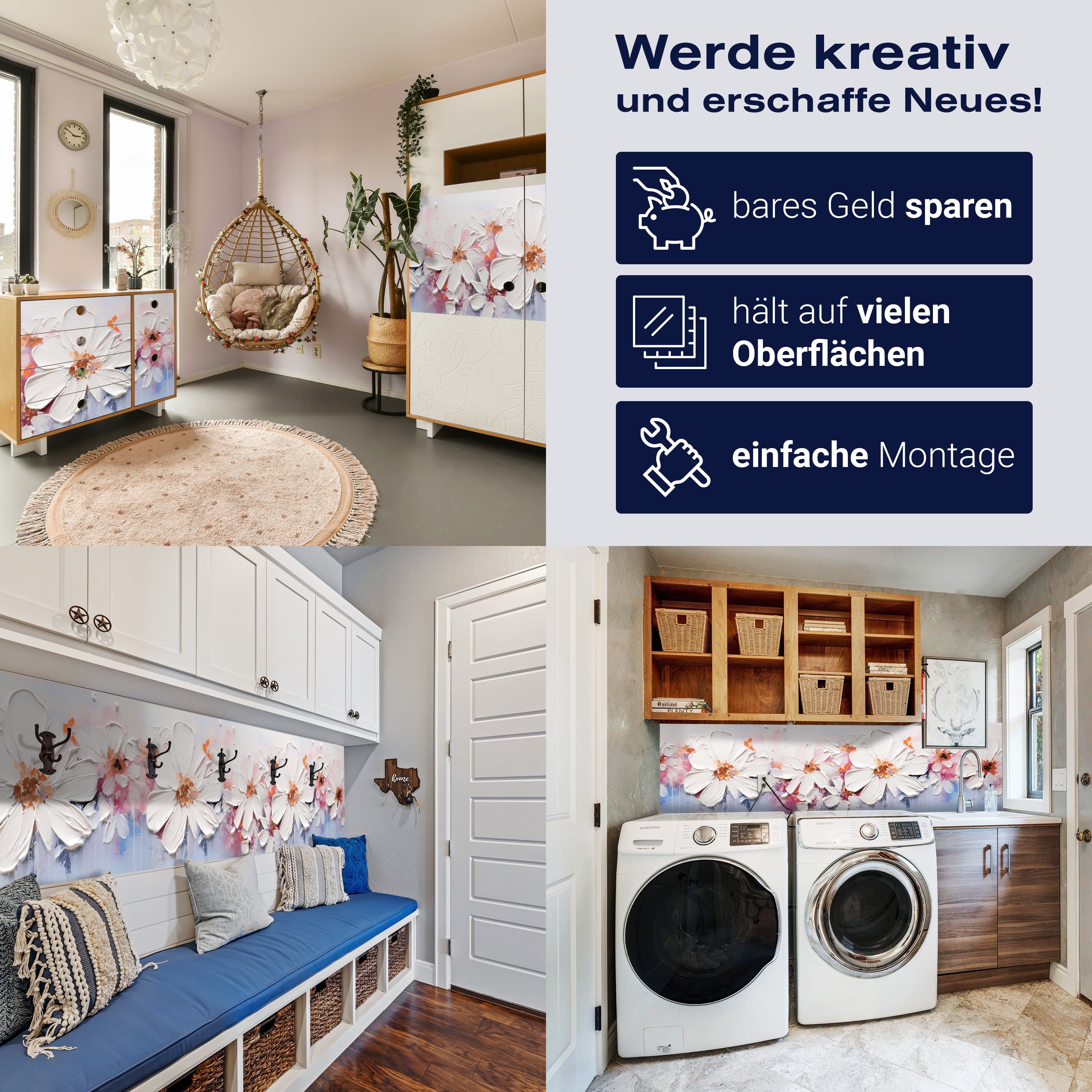 - Selbstklebendes Vlies 150g/m²: Einfach anzubringen, perfekt für Mietwohnungen.