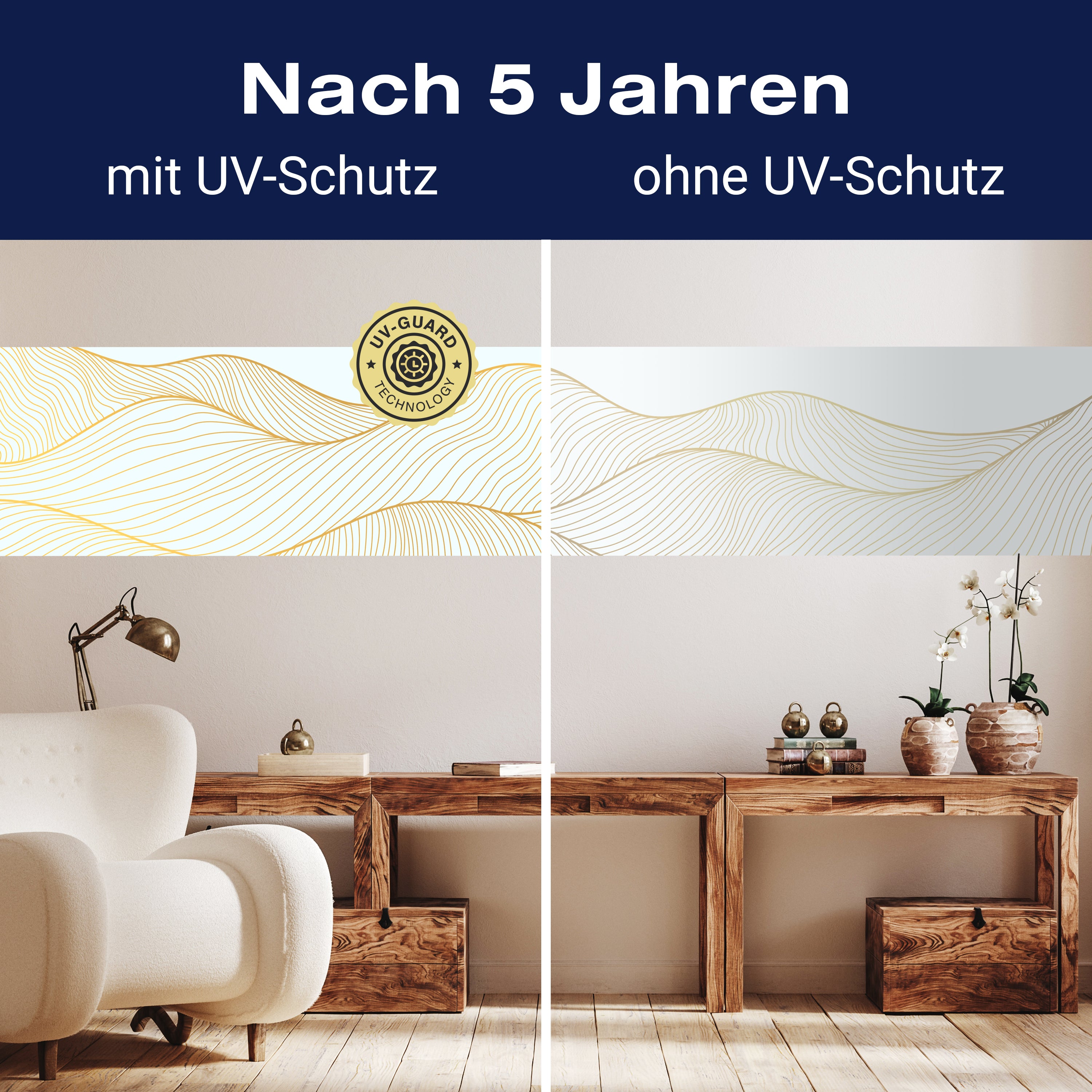 Setze auf die UV-Guard-Technologie, um deine selbstklebenden Panorama-Fototapeten nicht nur atemberaubend, sondern auch dauerhaft strahlend zu gestalten. Dieser fortschrittliche UV-Schutz sorgt dafür, dass die lebhaften Farben und scharfen Details deiner Wandgestaltung gegen die bleichende Wirkung der Sonnenstrahlen geschützt sind. Egal, wie intensiv das Sonnenlicht ist, die UV-Guard-Technologie bewahrt die Brillanz und Tiefe deiner Bilder, sodass sie jahrelang wie neu aussehen. Mach dir keine Sorgen mehr über verblassende Farben oder den Verlust von Detailreichtum. Mit dieser Technologie investierst du in die Langlebigkeit und Schönheit deiner Räume. Steige jetzt um auf UV-Guard und genieße ungetrübte Farbenpracht bei jedem Licht.