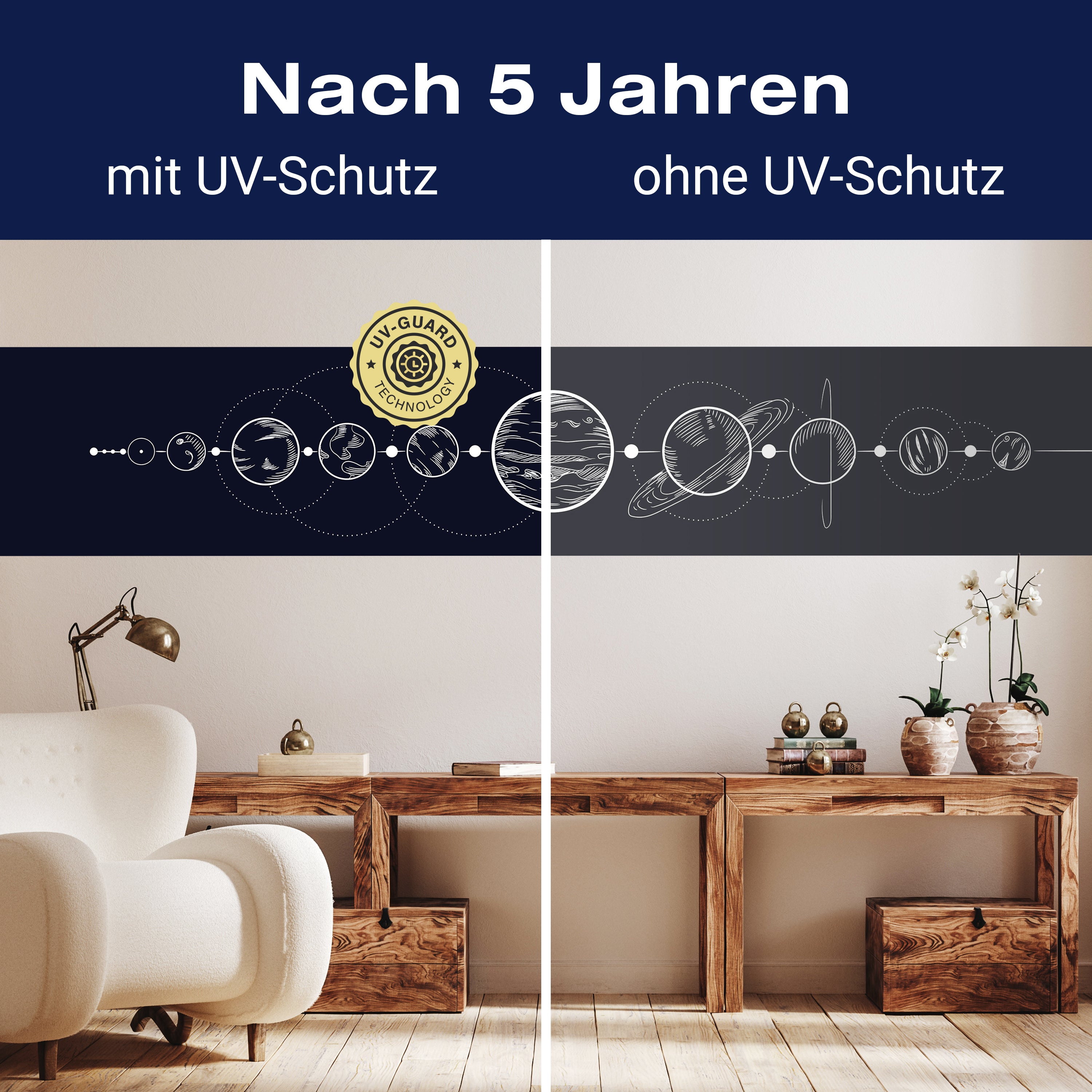 Setze auf die UV-Guard-Technologie, um deine selbstklebenden Panorama-Fototapeten nicht nur atemberaubend, sondern auch dauerhaft strahlend zu gestalten. Dieser fortschrittliche UV-Schutz sorgt dafür, dass die lebhaften Farben und scharfen Details deiner Wandgestaltung gegen die bleichende Wirkung der Sonnenstrahlen geschützt sind. Egal, wie intensiv das Sonnenlicht ist, die UV-Guard-Technologie bewahrt die Brillanz und Tiefe deiner Bilder, sodass sie jahrelang wie neu aussehen. Mach dir keine Sorgen mehr über verblassende Farben oder den Verlust von Detailreichtum. Mit dieser Technologie investierst du in die Langlebigkeit und Schönheit deiner Räume. Steige jetzt um auf UV-Guard und genieße ungetrübte Farbenpracht bei jedem Licht.