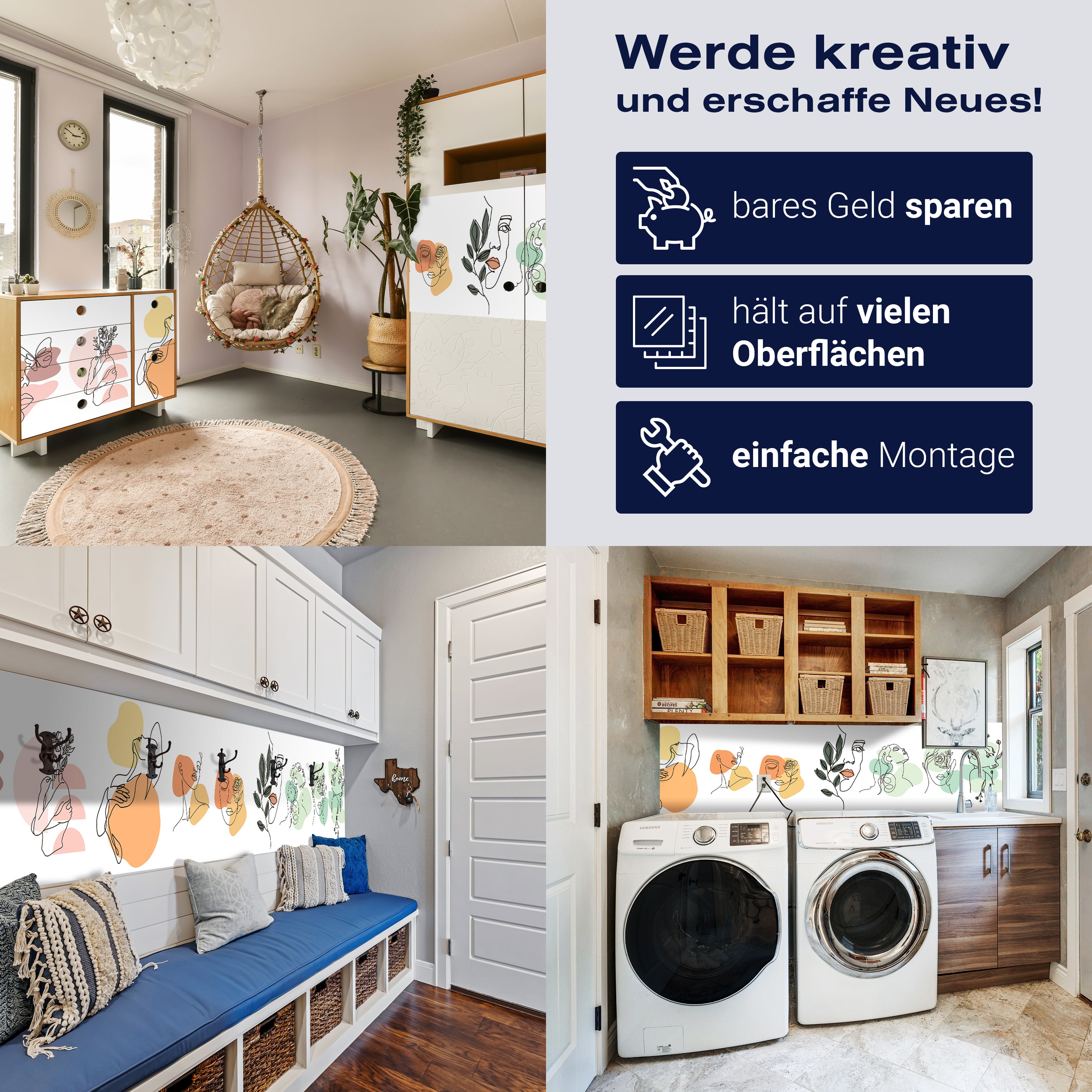 - Selbstklebendes Vlies 150g/m²: Einfach anzubringen, perfekt für Mietwohnungen.