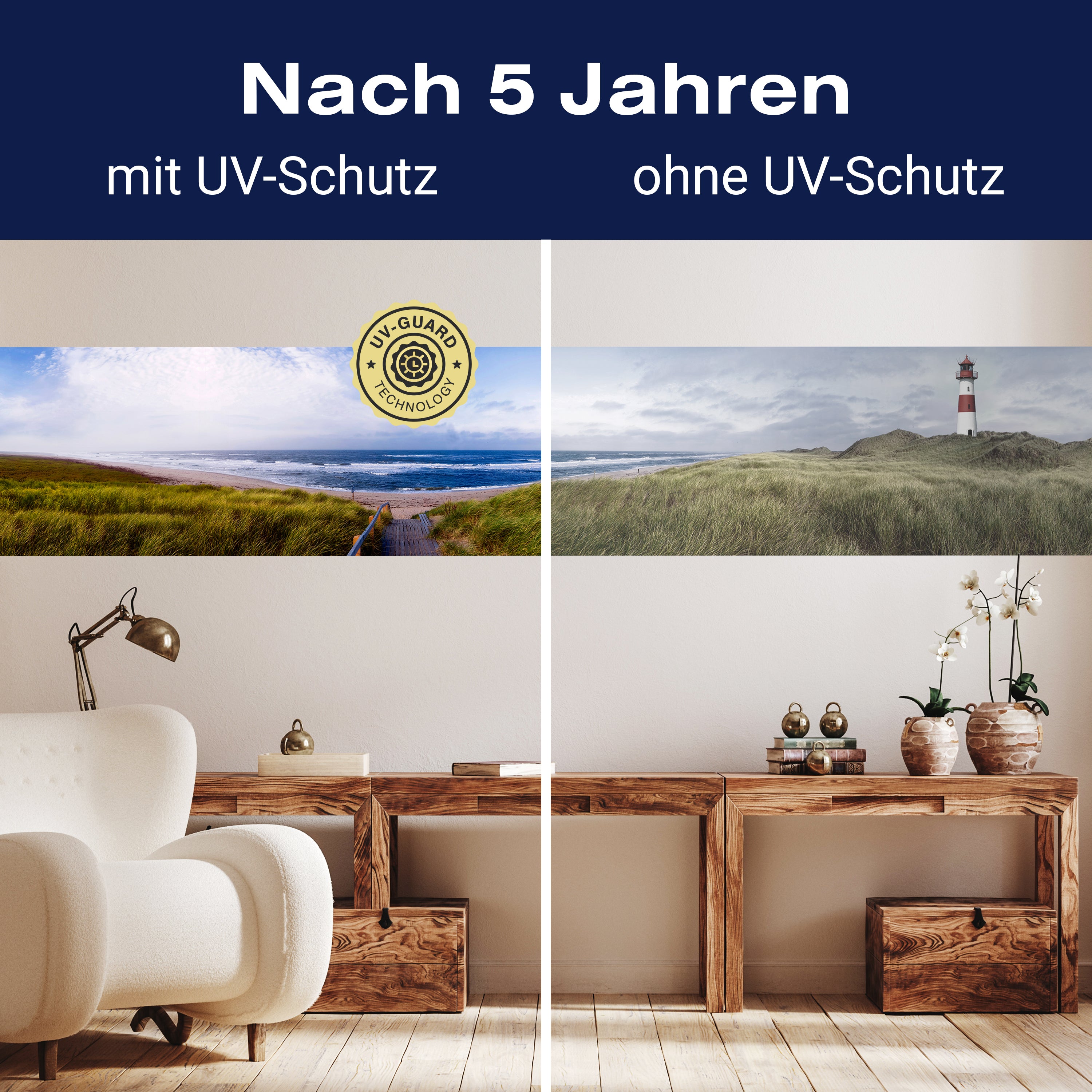 Setze auf die UV-Guard-Technologie, um deine selbstklebenden Panorama-Fototapeten nicht nur atemberaubend, sondern auch dauerhaft strahlend zu gestalten. Dieser fortschrittliche UV-Schutz sorgt dafür, dass die lebhaften Farben und scharfen Details deiner Wandgestaltung gegen die bleichende Wirkung der Sonnenstrahlen geschützt sind. Egal, wie intensiv das Sonnenlicht ist, die UV-Guard-Technologie bewahrt die Brillanz und Tiefe deiner Bilder, sodass sie jahrelang wie neu aussehen. Mach dir keine Sorgen mehr über verblassende Farben oder den Verlust von Detailreichtum. Mit dieser Technologie investierst du in die Langlebigkeit und Schönheit deiner Räume. Steige jetzt um auf UV-Guard und genieße ungetrübte Farbenpracht bei jedem Licht.