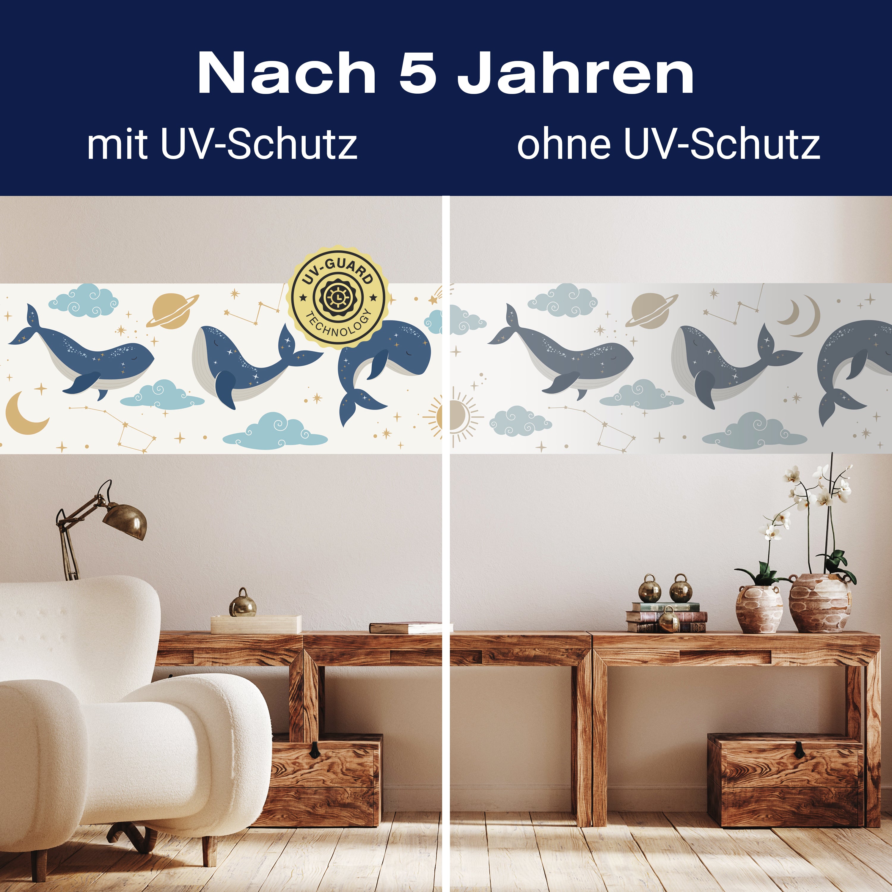 Setze auf die UV-Guard-Technologie, um deine selbstklebenden Panorama-Fototapeten nicht nur atemberaubend, sondern auch dauerhaft strahlend zu gestalten. Dieser fortschrittliche UV-Schutz sorgt dafür, dass die lebhaften Farben und scharfen Details deiner Wandgestaltung gegen die bleichende Wirkung der Sonnenstrahlen geschützt sind. Egal, wie intensiv das Sonnenlicht ist, die UV-Guard-Technologie bewahrt die Brillanz und Tiefe deiner Bilder, sodass sie jahrelang wie neu aussehen. Mach dir keine Sorgen mehr über verblassende Farben oder den Verlust von Detailreichtum. Mit dieser Technologie investierst du in die Langlebigkeit und Schönheit deiner Räume. Steige jetzt um auf UV-Guard und genieße ungetrübte Farbenpracht bei jedem Licht.