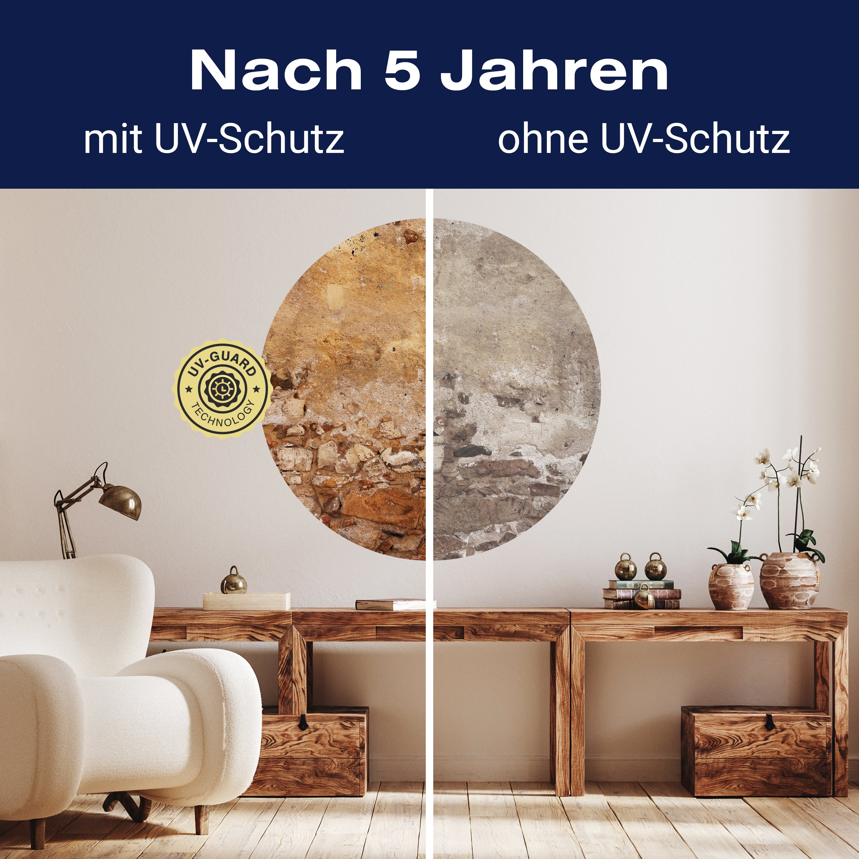 Setze auf die UV-Guard-Technologie, um deine selbstklebenden Panorama-Fototapeten nicht nur atemberaubend, sondern auch dauerhaft strahlend zu gestalten. Dieser fortschrittliche UV-Schutz sorgt dafür, dass die lebhaften Farben und scharfen Details deiner Wandgestaltung gegen die bleichende Wirkung der Sonnenstrahlen geschützt sind. Egal, wie intensiv das Sonnenlicht ist, die UV-Guard-Technologie bewahrt die Brillanz und Tiefe deiner Bilder, sodass sie jahrelang wie neu aussehen. Mach dir keine Sorgen mehr über verblassende Farben oder den Verlust von Detailreichtum. Mit dieser Technologie investierst du in die Langlebigkeit und Schönheit deiner Räume. Steige jetzt um auf UV-Guard und genieße ungetrübte Farbenpracht bei jedem Licht.