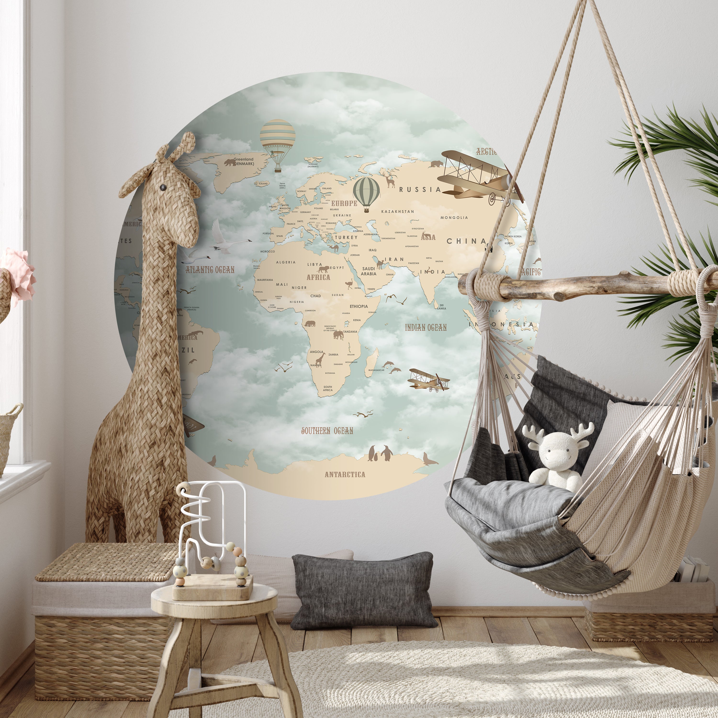 Träumst Du davon, Deine Wände in eine beeindruckende Kunstgalerie zu verwandeln? Mit unserer hochwertigen, runden Fototapete Weltkarte für Kinder M0017 ist es jetzt möglich! Jede Wand wird zu einer Leinwand Deiner Kreativität.