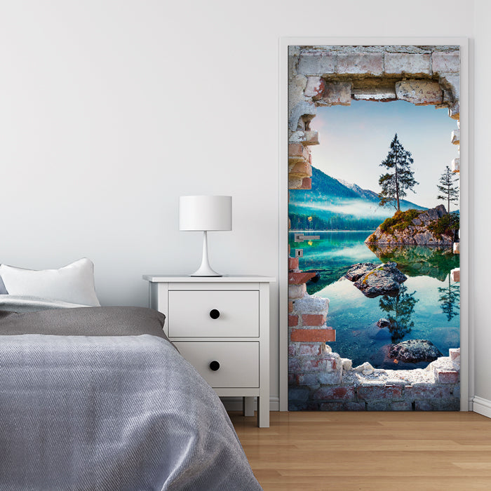 Entdecke die Türtapete 3D Backstein, See, Berge, Baum, Felsen