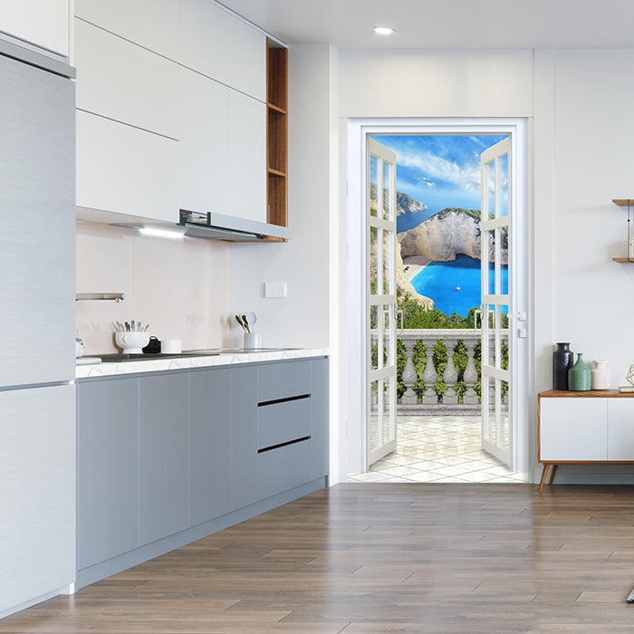 Entdecke die Türtapete Ausblick von Balkon, Meer, Küste, Felsen