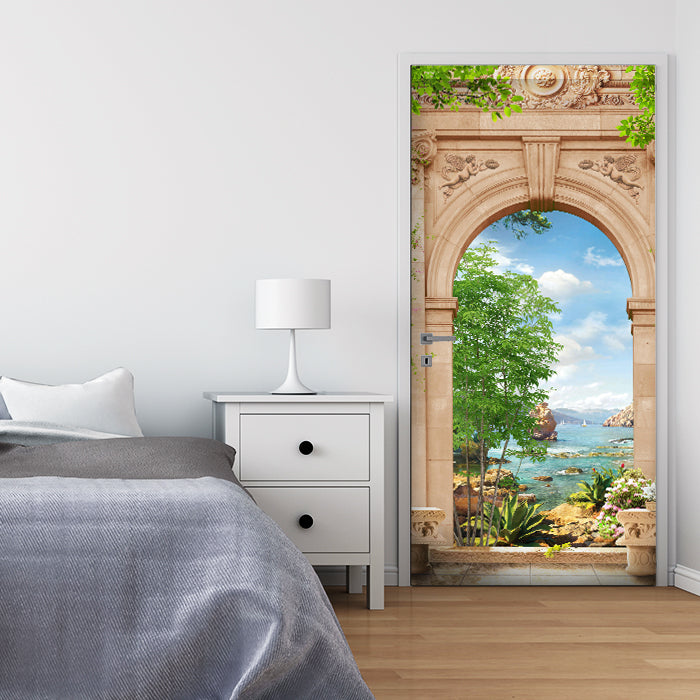 Entdecke die Türtapete Blick aufs Meer, Torbogen, Pflanzen