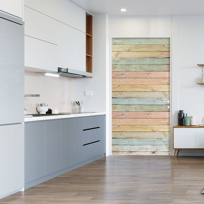 Entdecke die Türtapete bunte Holzplatte, Palisaden, bunt, Holz