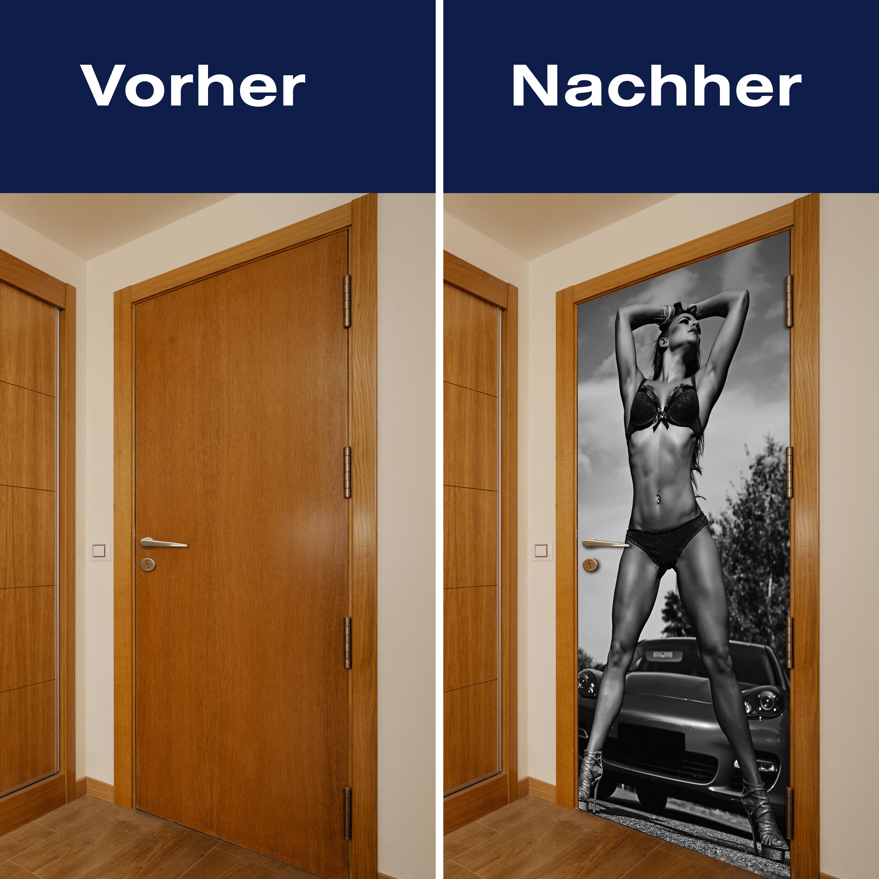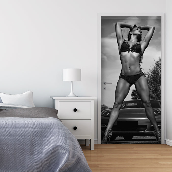 Entdecke die Türtapete Frau, Auto, Sportwagen, schwarz weiß