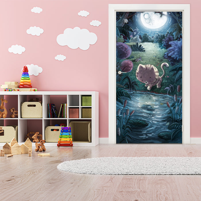 Entdecke die Türtapete Illustration, Katze, Fluss, Nacht