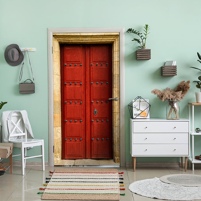 Entdecke die Türtapete rote Holztür, Maserung, Holz, Metall