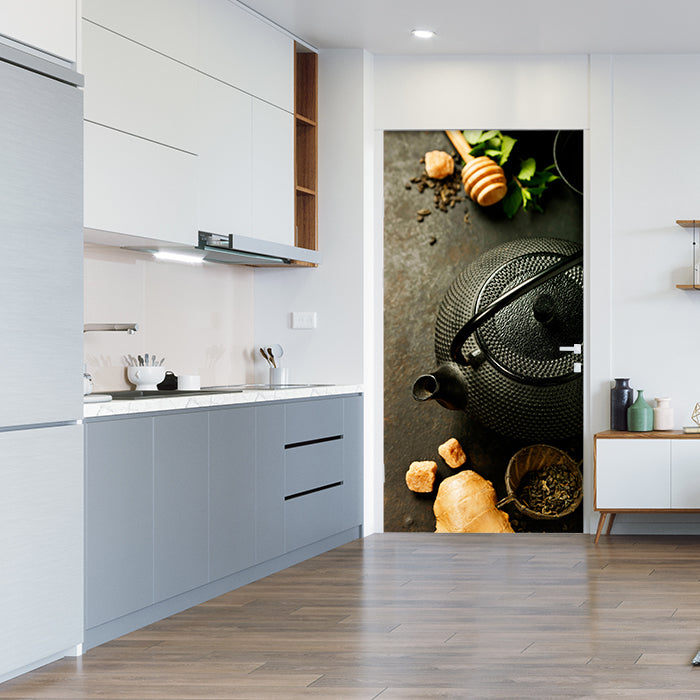 Entdecke die Türtapete Rustikale Teekanne mit Ingwer und Minze