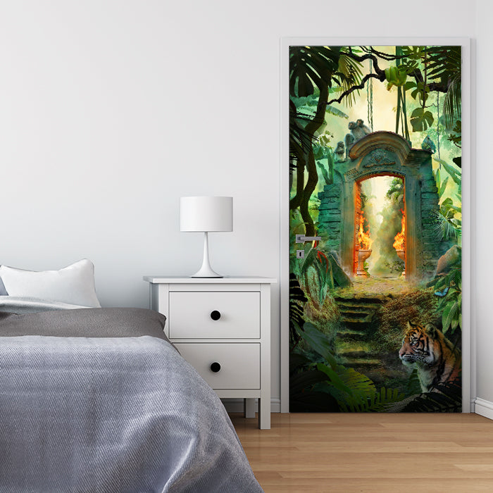 Entdecke die Türtapete Steintor im Dschungel, Feuer, Tiger
