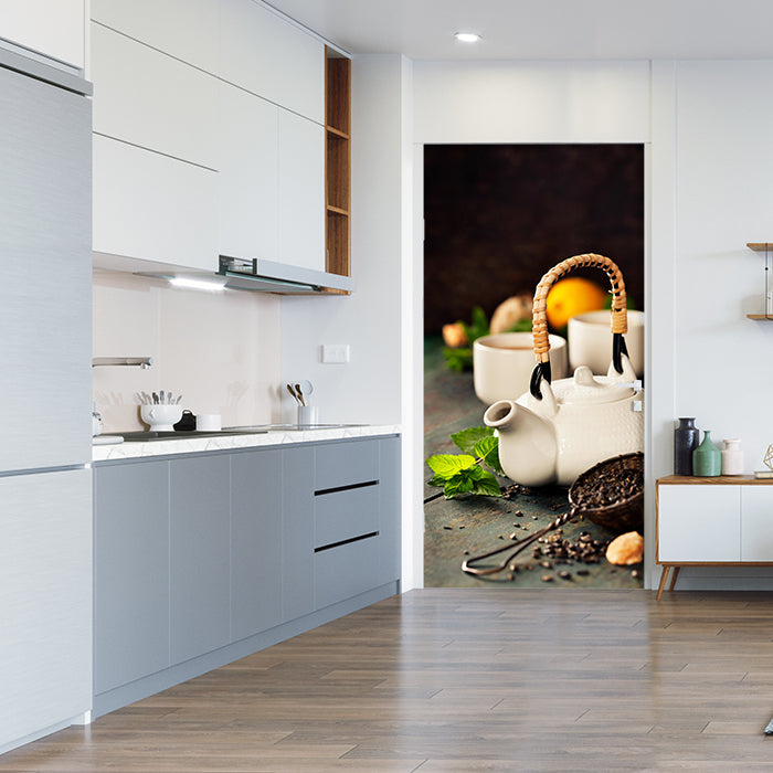 Entdecke die Türtapete Teekanne und Tasse Tee mit Minze