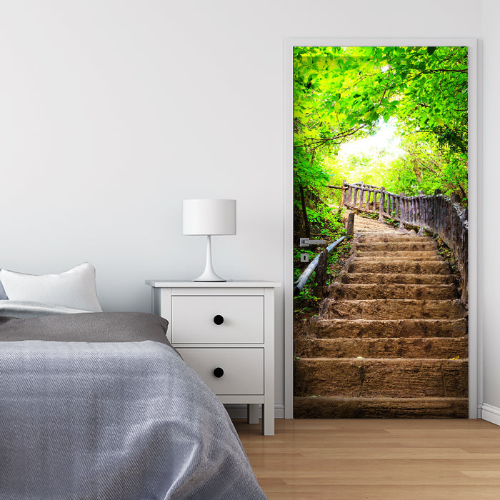 Entdecke die Türtapete Treppe im Wald, Steintreppe, Holz, Bäume